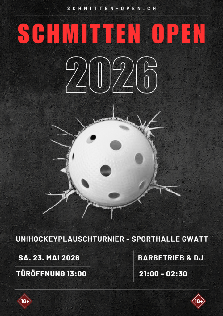Am 23. Mai 2026 werden sich in Schmitten in der Turnhalle Gwatt motivierte Plauschmannschaften der Region innerhalb eines intensiven Unihockeyturniers messen. Meldet euch an, sodass auch ihr um den Titel des Schmitten Opens 2026 kämpfen könnt!